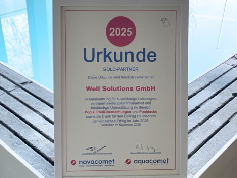 Wir sind Gold-Partner von Novacomet Wir freuen uns sehr, dass wir mit der Gold-Partner Urkunde von Novacomet und Aquacomet ausgezeichnet wurden. Diese Urkunde wurde uns feierlich verliehen als Anerkennung für unsere zuverlässigen Leistungen, die vertrauensvolle Zusammenarbeit sowie unsere Unterstützung im Bereich Pools, Poolüberdachungen und Pooldecks. Als Unternehmen, das sich auf hochwertige Poollösungen spezialisiert hat, legen […]